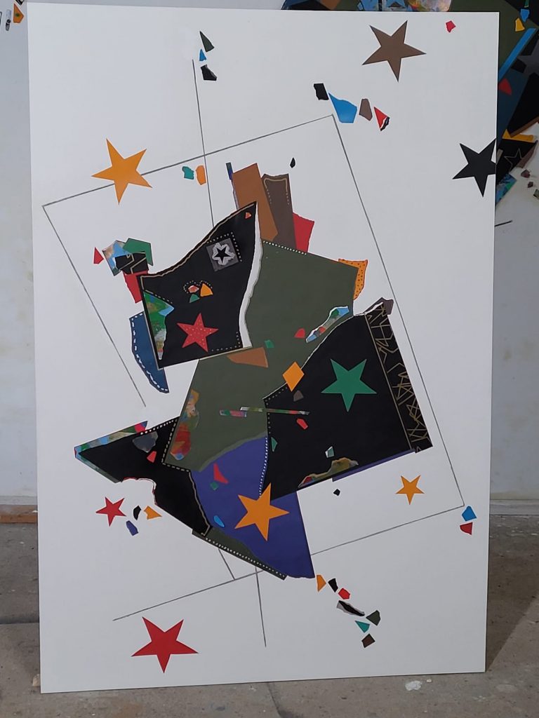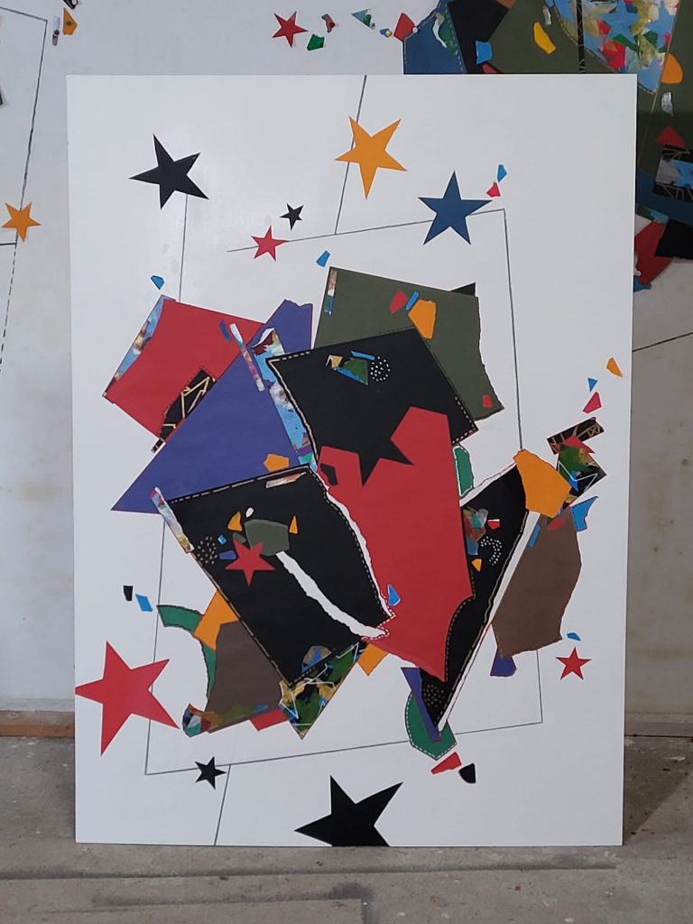L’assemblage des éléments constituant l’œuvre se fait peu à peu sans projet préalablement établi, sans esquisses, simplement par adjonctions successives autour de quelques chutes de ces papiers préalablement peints puis déchiquetés, tranchés net ou récupérés. Ce faire est ainsi un savoir-faire acquis au fil des ans par l’artiste, acquis dans une expérimentation toujours nouvelle. L’œuvre relève en quelque sorte de la prolifération, une prolifération où le figuré, les étoiles, par exemple, côtoient les chutes de papiers peints et déchirés, dénuées de références à quoi que ce soit. Ainsi le sens, toujours flottant, naît de l’assemblage d’éléments figurants (des étoiles, par exemple) et d’éléments en tant que pures formes plastiques. Cet art ne comporte point d’études préalables, c’est un art de la chute, de la récupération et de décisions spontanées.