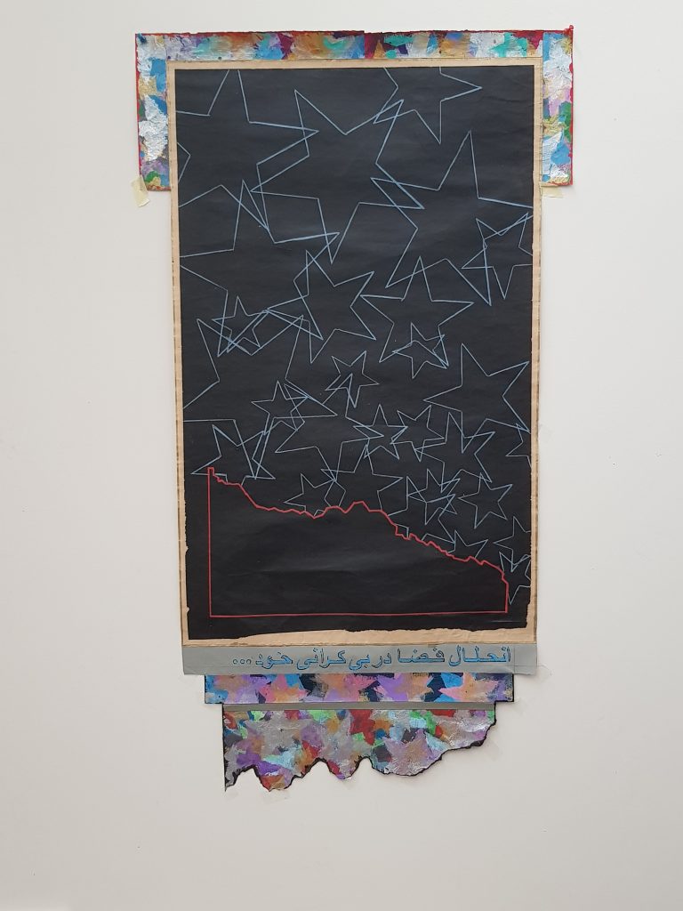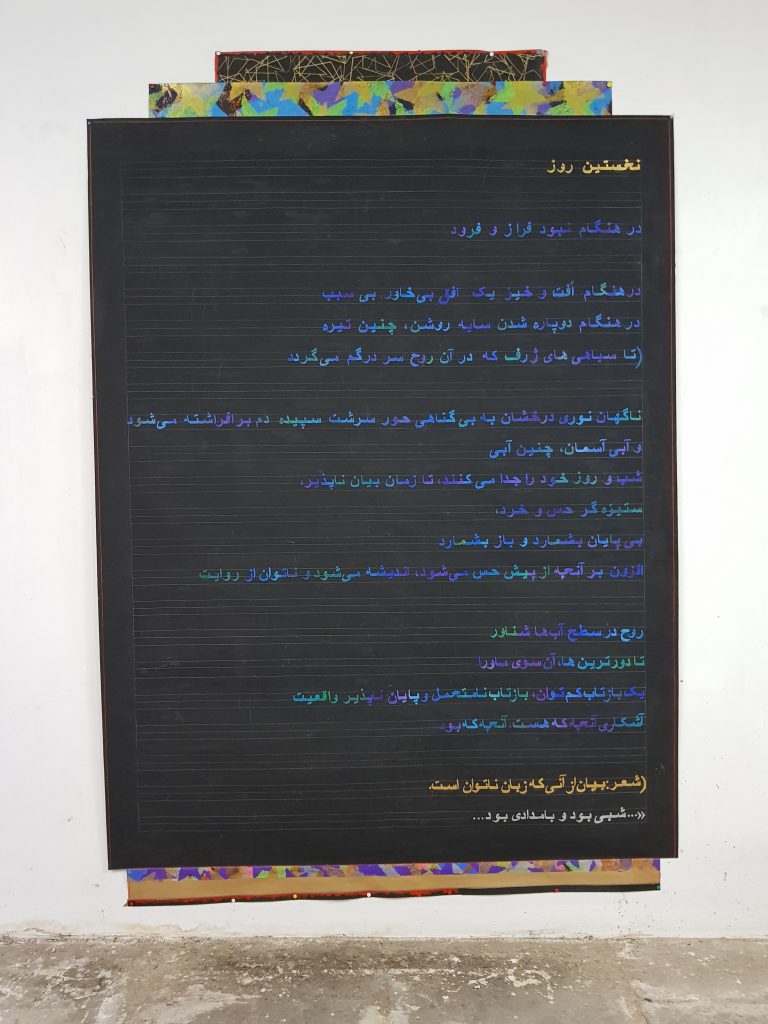 Et c’est lors de l’exposition du Musée d’art contemporaind’Ispahan, en 2019, qu’elle s’inscrit sur le mur, de plain pied, aux côtés des œuvres picturales, sous la forme de transferts en grands formats, comme ceux qui accompagnent provisoirement et expliquent les expositions des musées. A part entière et à parts égales avec le peint et gagnant ainsi un statut d’égalité avec la peinture, devenue ici médium lisible côtoyant, complétant le médium non littéralement lisible qu’est la peinture.