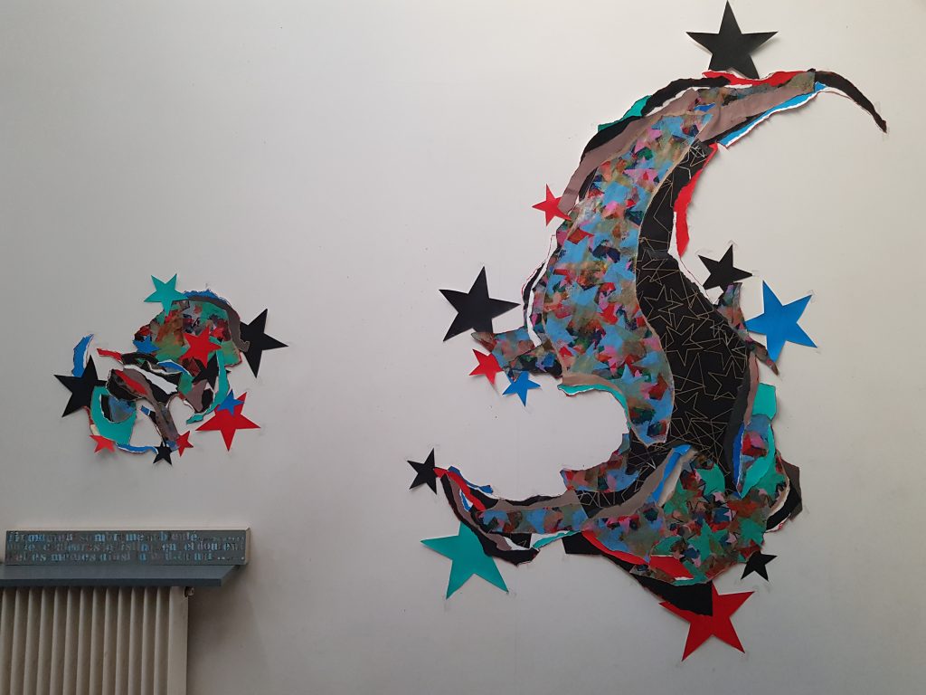 Ici il s’agit de peinture, dessins et collages qui nécessitent une maîtrise comme une autre, hors cadre, hors limites, hors standards du bien peint ou du mal peint. Le point de départ est constitué d’une réserve de grandes feuilles de papiers, peintes en couleurs vives, couvertes de milliers d’étoiles tamponnées au pochoir ou tracées au marqueur. C’est dans ce réservoir que sont puisés des morceaux, des lambeaux, arrachés au corps du papier préalablement peint, puis assemblés, constituant peu à peu le corps et le cœur de l’œuvre auxquels s’adjoignent peu à peu des chutes de découpages antérieurs, des chutes d’autres œuvres. Il n’y a là aucun projet que celui qu’impose une pratique poursuivie, sans esquisse formalisée. Des logiques d’agencements s’imposent peu à peu, débouchant peu ou prou sur un faire aux rituels installés en même temps qu’implicites. Le noir, le doré, le étoiles mordorées, les aplats, les cernes, tout cela constitue un vocabulaire plastique, une écriture, un style, à la fois une aventure et une expérience qui, dans sa répétition finit par devenir un savoir faire que Brigaudiot ne tardera certes point à transgresser; le faire à force de se faire se réinvente et va de l’avant vers l’ailleurs.
