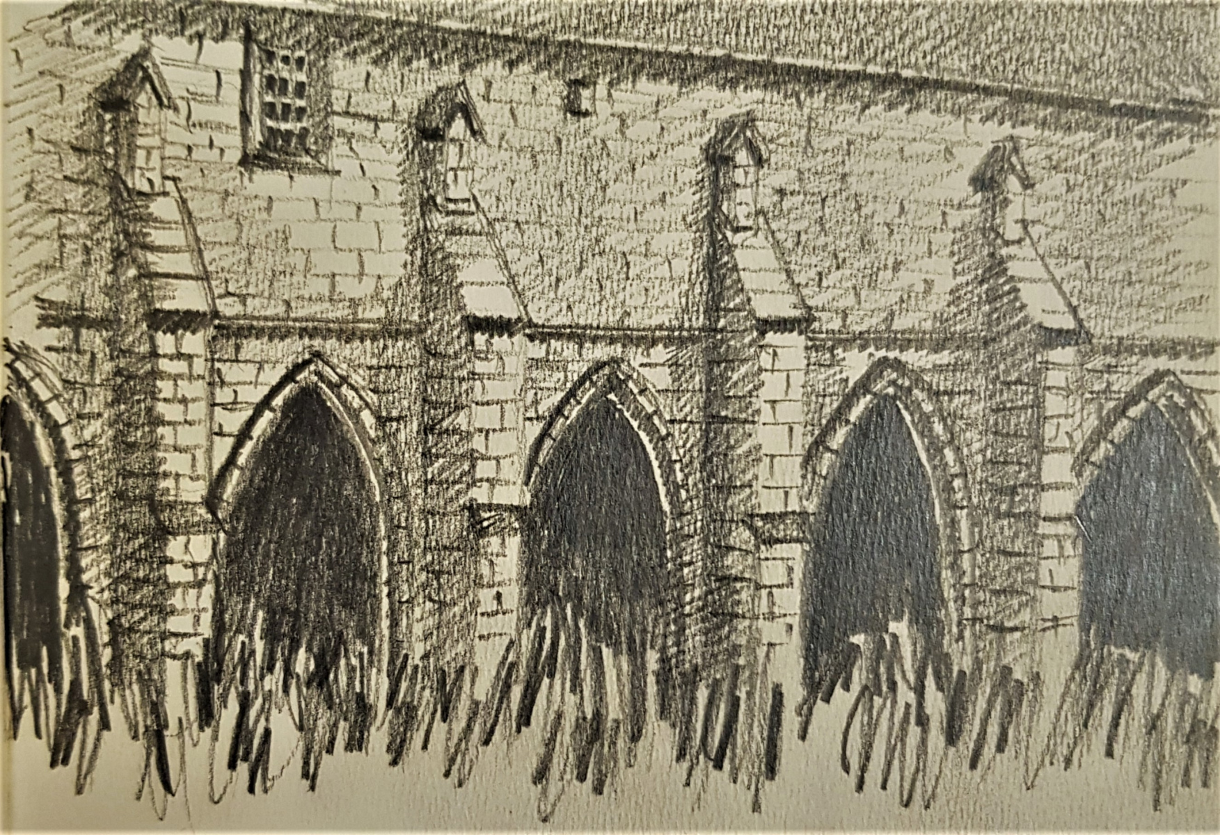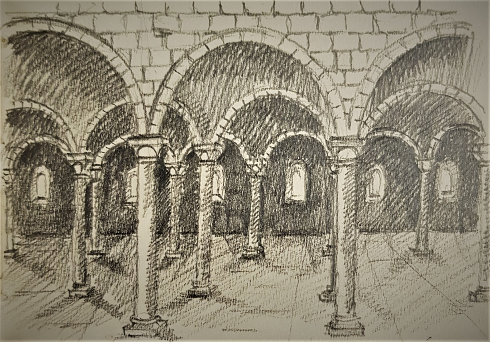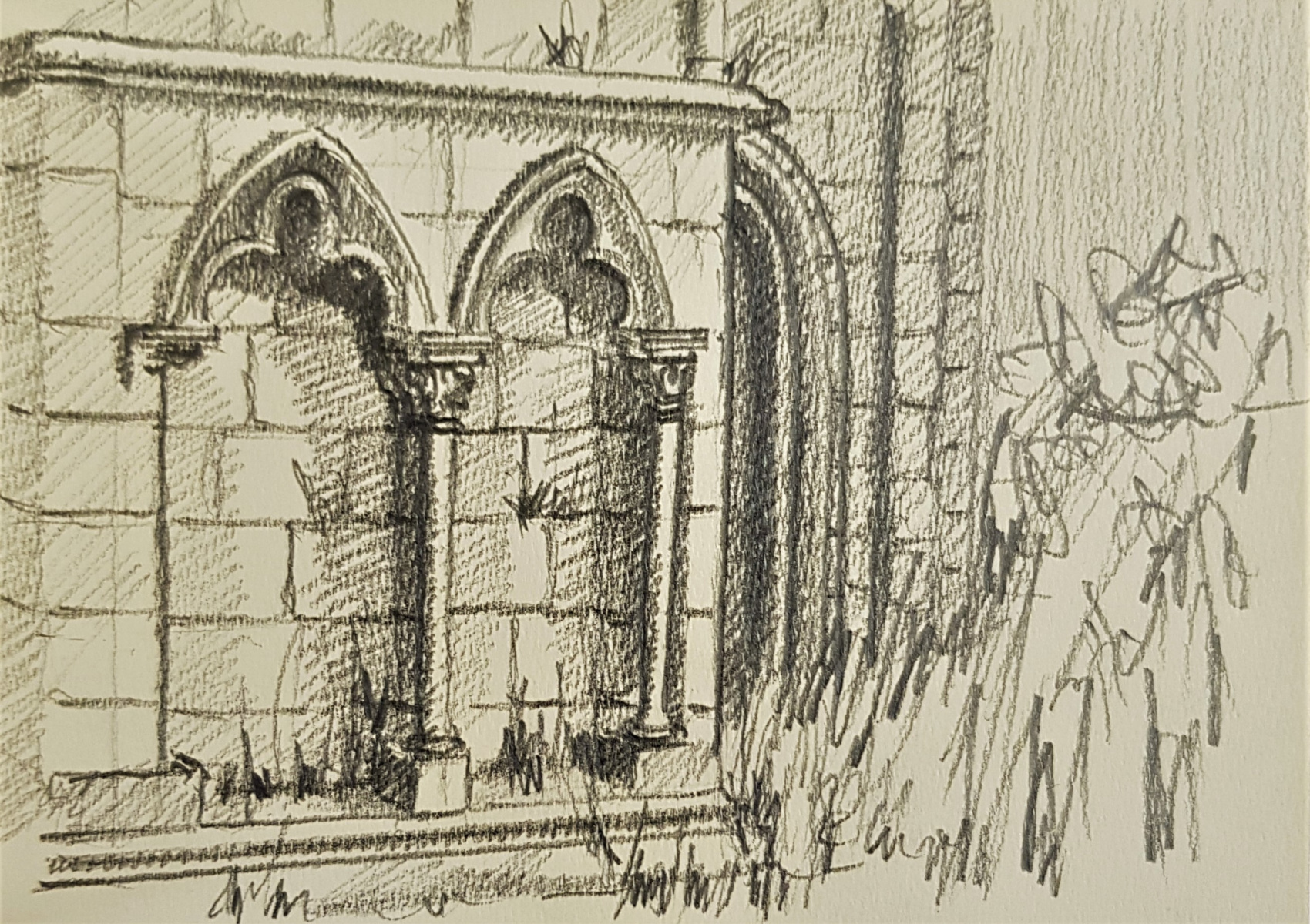 Il s’agit d’une période intermédiaire, qui s’est d’abord limitée à des prises de vues, des recherches et répertoires photographiques. Durant de longs mois, Brigaudiot procéda à une accumulation de photos de paysages en vue d’un débouché qui ne vint pas, ou pas comme il pouvait l’imaginer et le souhaiter. En même temps, Brigaudiot photographiait des sites religieux, églises, cloîtres et monastères anciens plus ou moins abandonnés: poésie de lieux en déshérence. Ce sont des lieux de silence et de recueillement, lieux chargés d’histoire et de spiritualité, dégageant une atmosphère onirique auxquels il était particulièrement attaché. Puis s’ensuivirent des carnets de dessins où apparurent ces bâtiments. Dessins d’après photos, suivis de travaux picturaux centrés sur des figures d’arcs brisés gothiques ou romans, ce à quoi s’ajoutait quelquefois un support spécifique, comme par exemple, un miroir, une plaque de verre, une page imprimée, la préface de l’exposition des Palimpsestes, préface rédigée par l’ami psychanalyste Stoïan Stoïanoff, rien d’anodin, ici. Les églises furent une  période d’entre-deux, jamais montrée, sommeillant dans les réserves des ateliers et constituant avant tout une réflexion, une interrogation, une hypothèse, et sans doute également une ramification dans la période des Paysages Discontinus.