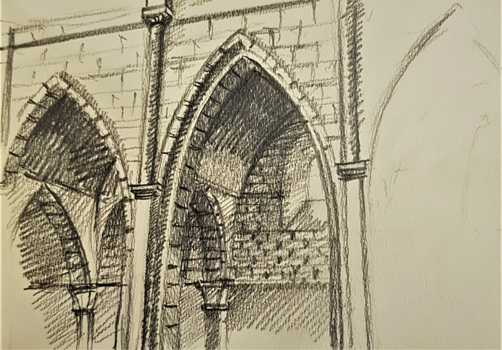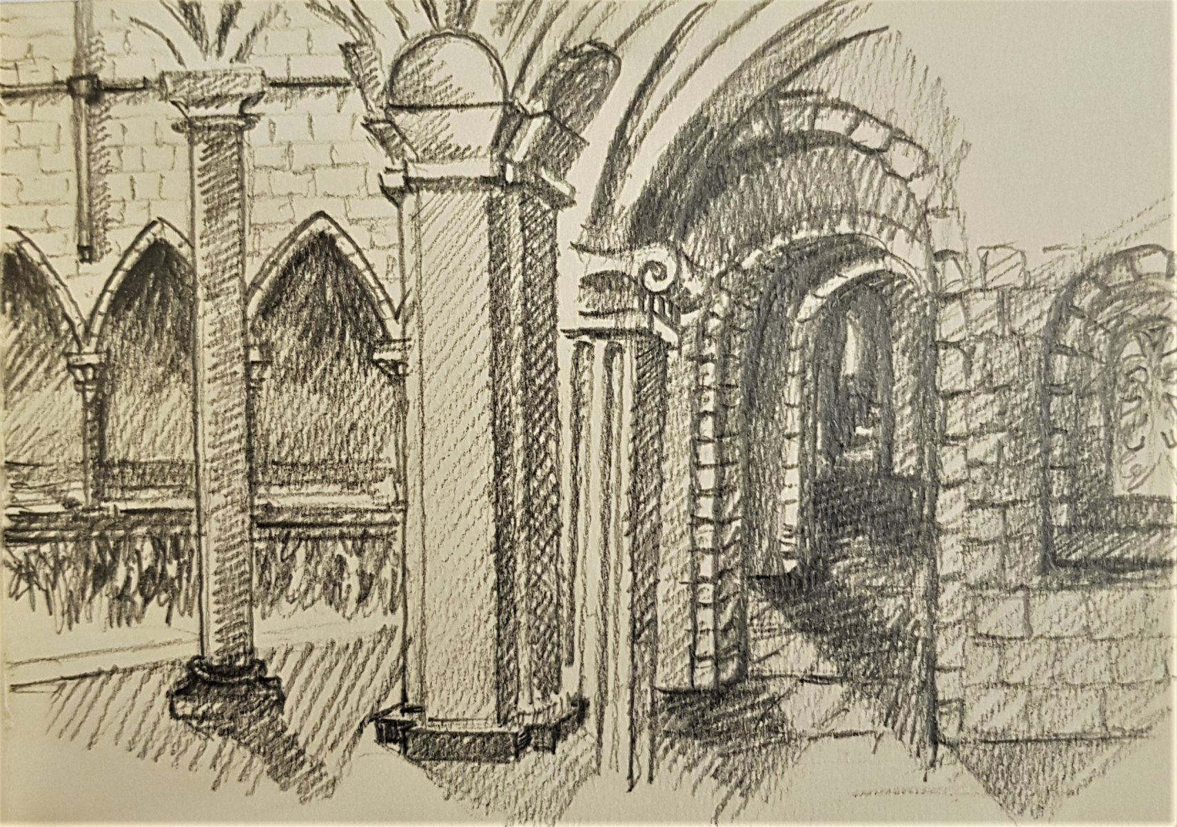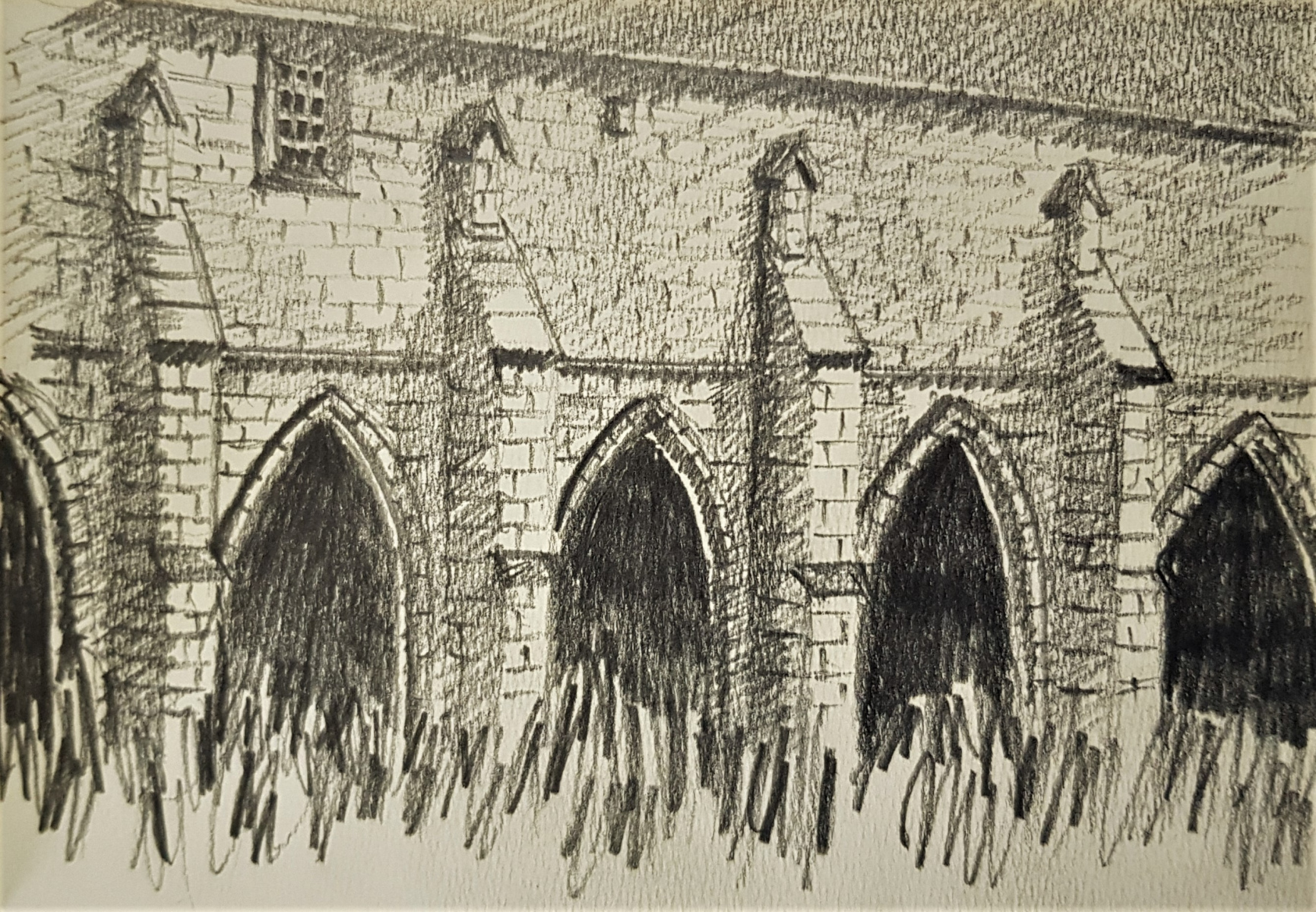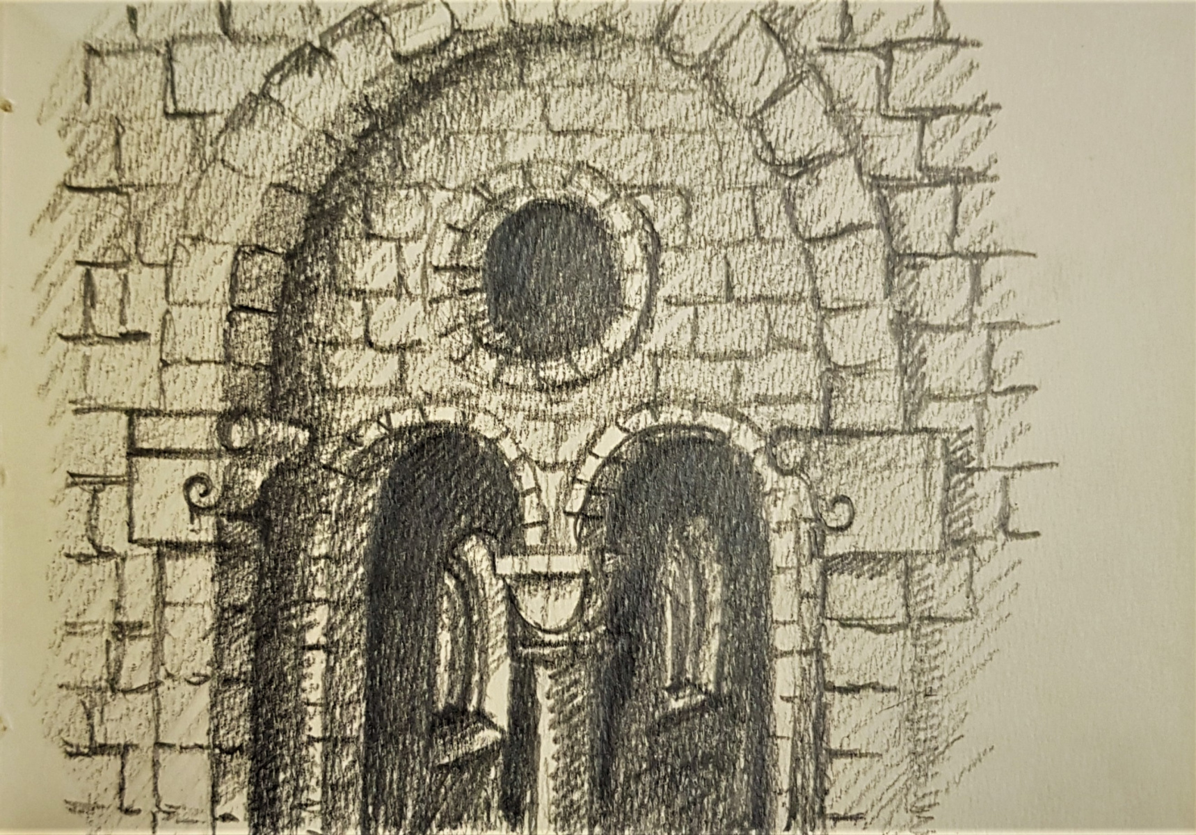 Il s’agit d’une période intermédiaire, qui s’est d’abord limitée à des prises de vues, des recherches et répertoires photographiques. Durant de longs mois, Brigaudiot procéda à une accumulation de photos de paysages en vue d’un débouché qui ne vint pas, ou pas comme il pouvait l’imaginer et le souhaiter. En même temps, Brigaudiot photographiait des sites religieux, églises, cloîtres et monastères anciens plus ou moins abandonnés: poésie de lieux en déshérence. Ce sont des lieux de silence et de recueillement, lieux chargés d’histoire et de spiritualité, dégageant une atmosphère onirique auxquels il était particulièrement attaché. Puis s’ensuivirent des carnets de dessins où apparurent ces bâtiments. Dessins d’après photos, suivis de travaux picturaux centrés sur des figures d’arcs brisés gothiques ou romans, ce à quoi s’ajoutait quelquefois un support spécifique, comme par exemple, un miroir, une plaque de verre, une page imprimée, la préface de l’exposition des Palimpsestes, préface rédigée par l’ami psychanalyste Stoïan Stoïanoff, rien d’anodin, ici. Les églises furent une  période d’entre-deux, jamais montrée, sommeillant dans les réserves des ateliers et constituant avant tout une réflexion, une interrogation, une hypothèse, et sans doute également une ramification dans la période des Paysages Discontinus.