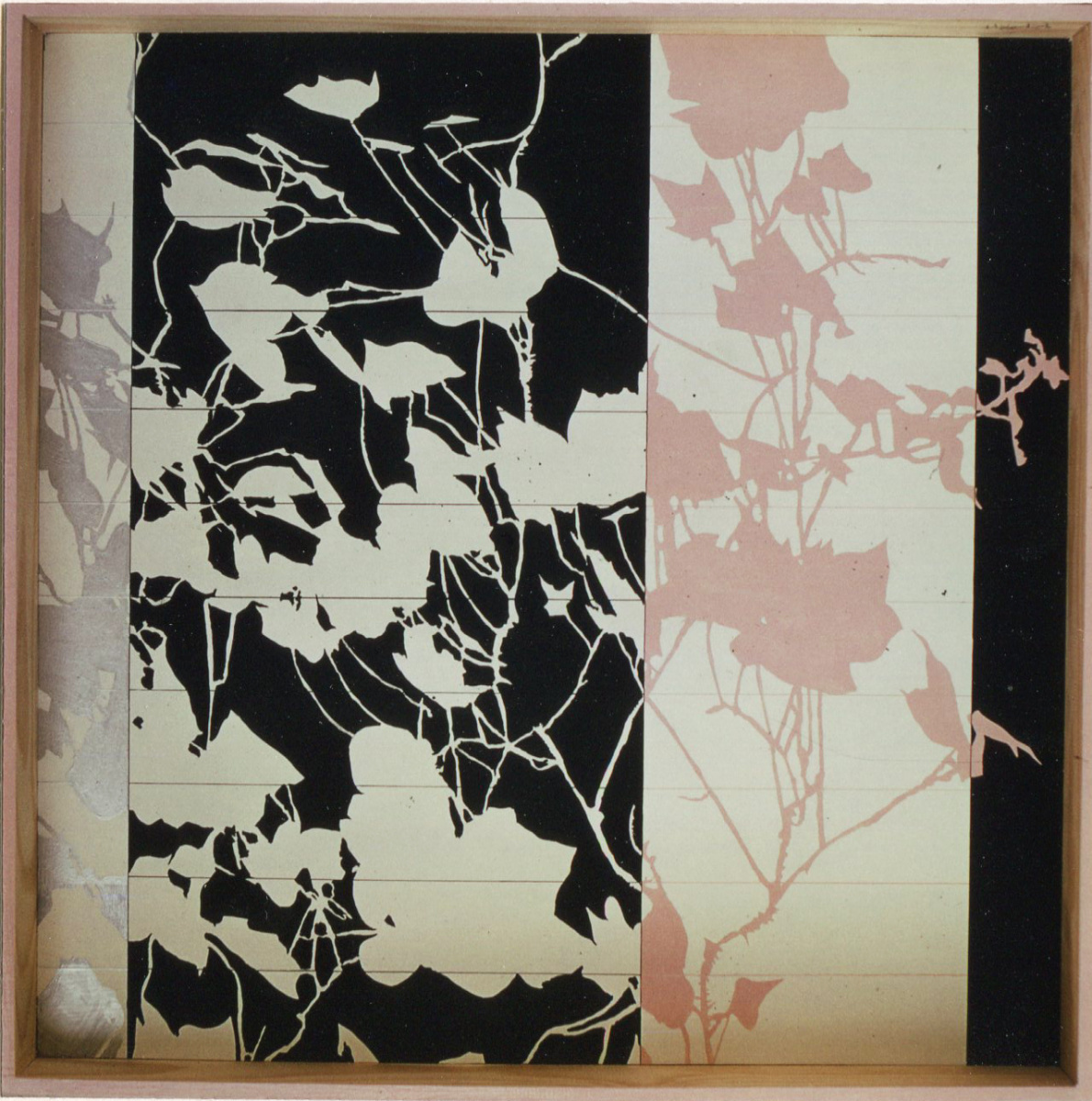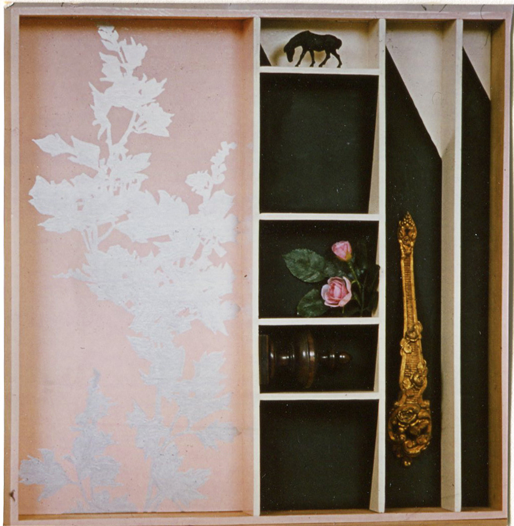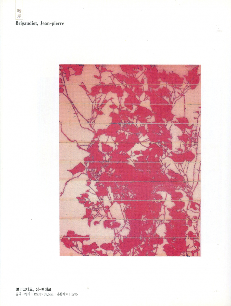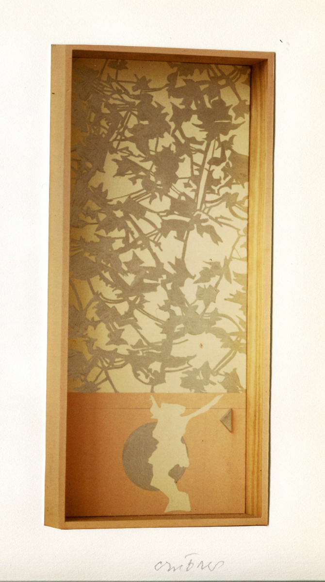 Cette période où l’ombre portée s’invite dans l’œuvre plastique va apporter à cette dernière une dimension poétique liée à ce que l’ombre implique de silence, de précarité temporelle, d’éphémère, d’ambigu, d’immatériel et de rapports complexes à ce qui la projette. L’ombre est souvent là, à nos côtés ou étendue sur le paysage sans même être perçue en tant que ce qu’elle est, un peu mystérieuse. Brigaudiot va intégrer des ombres à ses œuvres, jusqu’à en faire le sujet du tableau ou de l’objet. On est alors dans la période des œuvres roses, sculptures roses ou des mariées, puis des objets et tableaux-reliefs. L’atelier de Nice est sur la colline de Canta Galet et reçoit de point fouet la lumière solaire; des lierres pendent ça et là et dans la chaleur, leurs ombres bougent à peine sur le mur teinté de rose, crépi à la chaux. Travail de notation rapide des contours, report sur le support choisi. Il y aura des ombres de feuillages et des ombres d’objets, telle une chaise, qui seront fixées ainsi puis peintes en rose, parti pris d’un kitsch déjà éprouvé avec les mariées / sculptures roses. Ce rose chair sera pendant quelques années le label Brigaudiot, couleur insupportable pour certains détenteurs d’un vrai bon goût! Outre les ombres de feuillages déclinées de différentes façons dont quelques séries au crayon de couleur reportées sur calque, donnant lieu à des tirages sur papier transparent, il y a les ombres inscrites dans les tableaux-reliefs, objets d’assemblage d’objets divers: crucifix, petits jouets et figurines comme des moutons, fleurs artificielles. Ombres encore sur une série dite des pianos, objets de la famille rose, faussement fonctionnels avec leurs tiroirs et couvercles mobiles. Ces pianos sont réalisés à proximité d’une maquette de décor pour La Tentation de Saint Antoine, mise en scène par Jean-Marie Villégier.