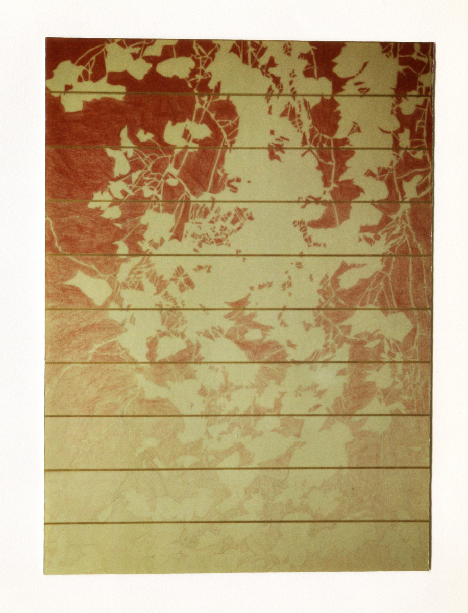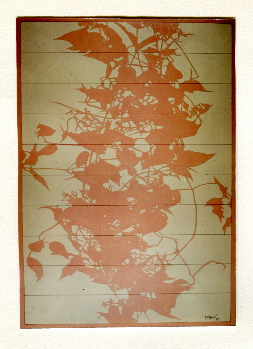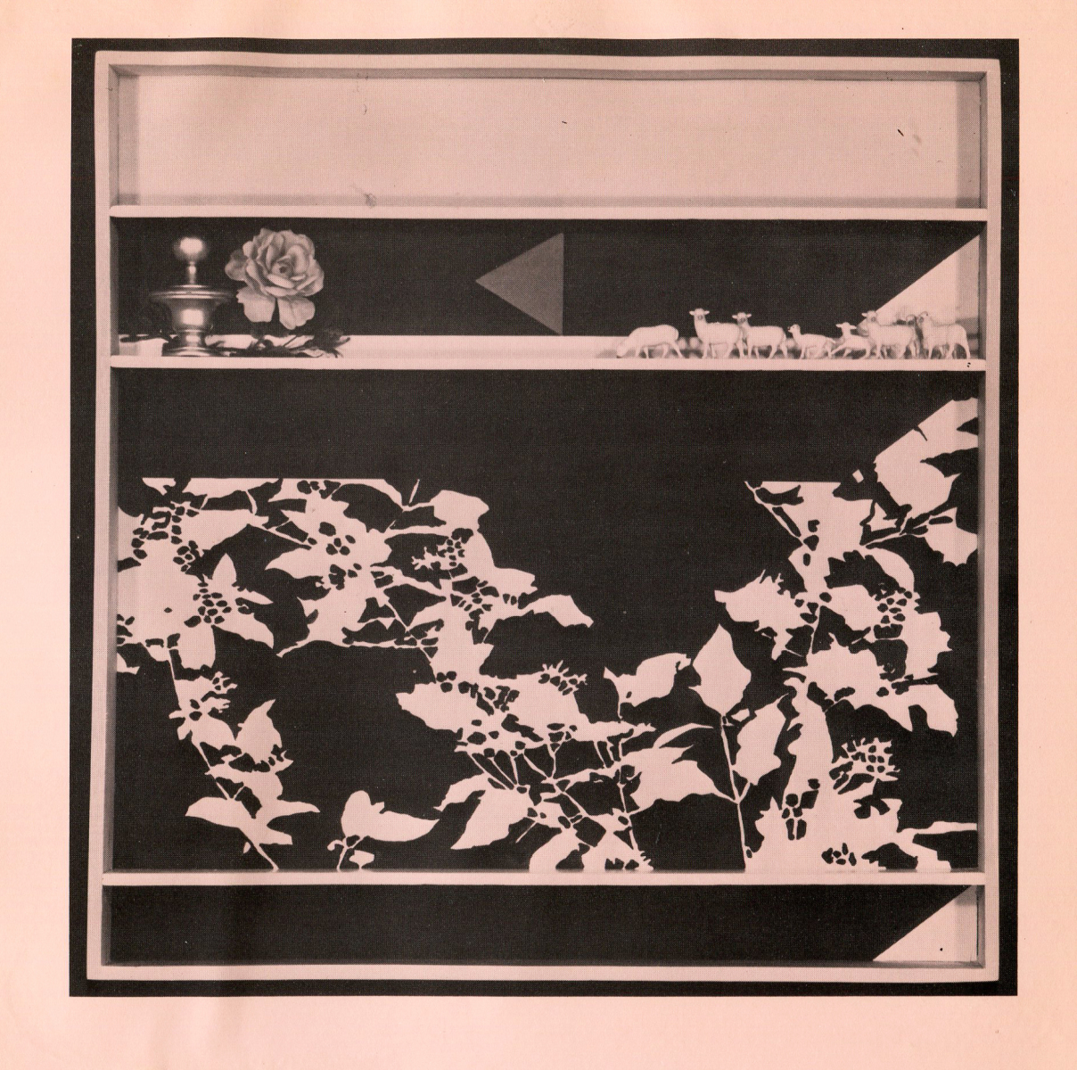 Cette période où l’ombre portée s’invite dans l’œuvre plastique va apporter à cette dernière une dimension poétique liée à ce que l’ombre implique de silence, de précarité temporelle, d’éphémère, d’ambigu, d’immatériel et de rapports complexes à ce qui la projette. L’ombre est souvent là, à nos côtés ou étendue sur le paysage sans même être perçue en tant que ce qu’elle est, un peu mystérieuse. Brigaudiot va intégrer des ombres à ses œuvres, jusqu’à en faire le sujet du tableau ou de l’objet. On est alors dans la période des œuvres roses, sculptures roses ou des mariées, puis des objets et tableaux-reliefs. L’atelier de Nice est sur la colline de Canta Galet et reçoit de point fouet la lumière solaire; des lierres pendent ça et là et dans la chaleur, leurs ombres bougent à peine sur le mur teinté de rose, crépi à la chaux. Travail de notation rapide des contours, report sur le support choisi. Il y aura des ombres de feuillages et des ombres d’objets, telle une chaise, qui seront fixées ainsi puis peintes en rose, parti pris d’un kitsch déjà éprouvé avec les mariées / sculptures roses. Ce rose chair sera pendant quelques années le label Brigaudiot, couleur insupportable pour certains détenteurs d’un vrai bon goût! Outre les ombres de feuillages déclinées de différentes façons dont quelques séries au crayon de couleur reportées sur calque, donnant lieu à des tirages sur papier transparent, il y a les ombres inscrites dans les tableaux-reliefs, objets d’assemblage d’objets divers: crucifix, petits jouets et figurines comme des moutons, fleurs artificielles. Ombres encore sur une série dite des pianos, objets de la famille rose, faussement fonctionnels avec leurs tiroirs et couvercles mobiles. Ces pianos sont réalisés à proximité d’une maquette de décor pour La Tentation de Saint Antoine, mise en scène par Jean-Marie Villégier.