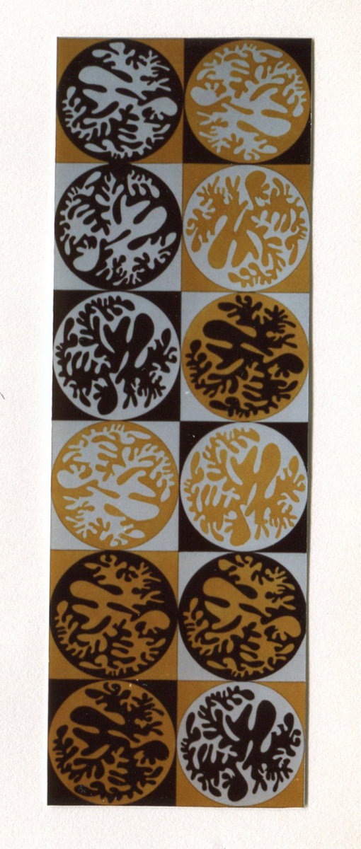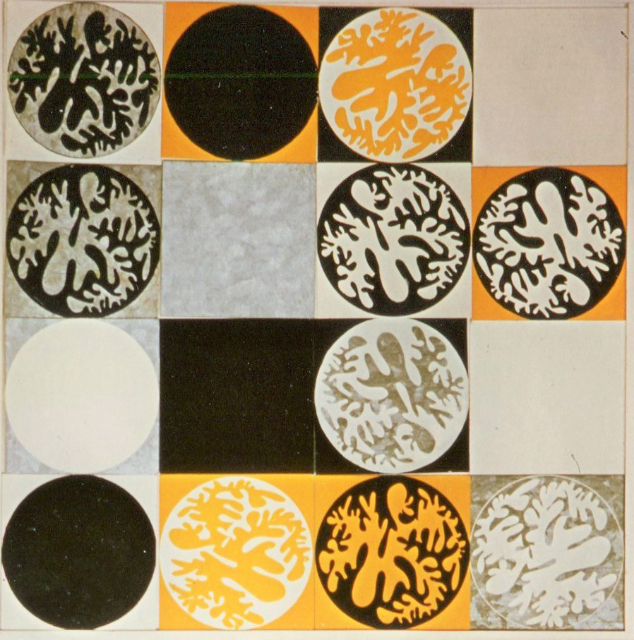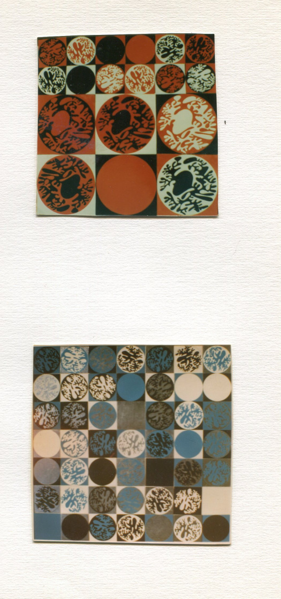 Il s’agit d’un art permutationnel fondé sur la modification visuelle du tableau par déplacements de ses éléments constitutifs: des carrés de métal peint et identiques en leurs dimensions. C’est un peu comme un puzzle où chaque pièce pourrait se placer au gré du joueur. Le support est un plan carré, un cadre de bois, parsemé régulièrement, géométriquement, d’aimants destinés à maintenir des modules de métal de mêmes formats, tous carrés et identiques. Le module de base est un carré de métal retenu à la surface du tableau par des aimants, il est donc déplaçable. Chaque tableau comporte un certain nombre de modules qui peuvent être déplacés et générer visuellement un grand nombre de possibilités combinatoires. Avec les tableaux magnétiques de Brigaudiot les carrés-modules sont possiblement monochromes, mais un motif, le plus souvent de type végétal, peut être présent dans un cercle inscrit pleinement dans le carré et peint en aplat en l’une des trois ou quatre couleurs constitutives du tableau. Fondé sur la combinatoire formelle, cet art permutationnel rejoint partiellement l’idéologie des abstractions géométriques excluant l’exhibition de la facture picturale ; la peinture ici utilisée est une laque industrielle. Une certaine mécanicité fonctionnelle et rationnelle prend le pas sur l’expression que privilégient d’autres formes d’abstractions non géométriques comme l’art informel, l’expressionnisme abstrait et l’abstraction lyrique.