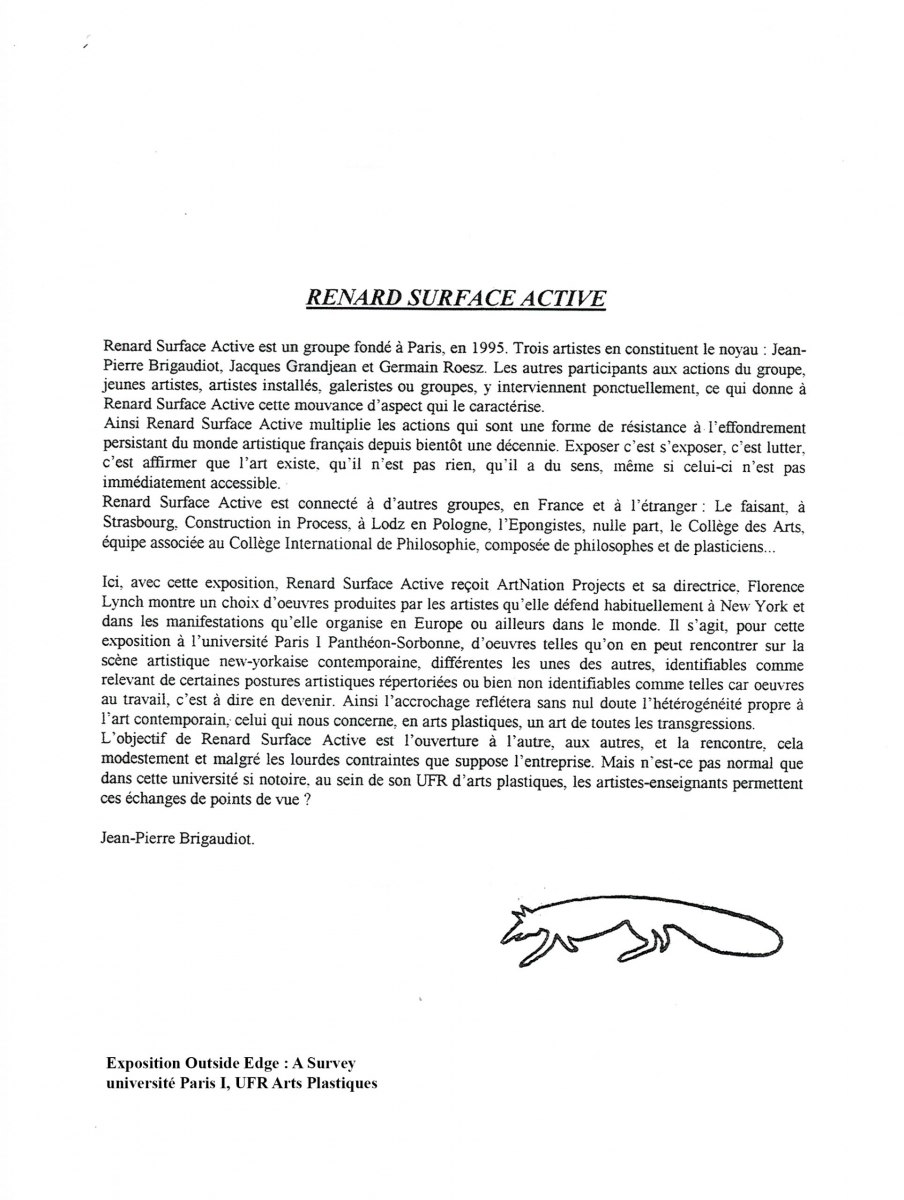 > 1999, Outside edge: A survey. Renard Surface Active invite Florence Lynch, directrice de la galerie new yorkaise, Art Nation Projects, à présenter un choix de ses artistes: Dorothy Arnold, Carlo Ferraris, Theresa Hackett, Noritoshi Hirakawa, Marcello Maloberti, Odili Donald Odita, Marina Temkina, Mary Ziegler.